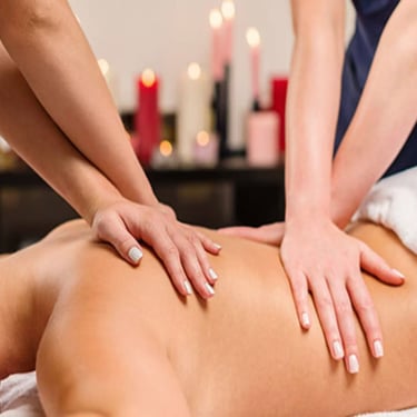Two therapists work simultaneously in a synchronized massage for a deeply immersive and relaxing experience.